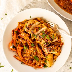 This creamy red pepper chicken recipe is packed with flavor! The sauce is creamy and saucy and chicken is soft and juicy. This recipe is easy, quick, requires one skillet, and a perfect weeknight recipe!